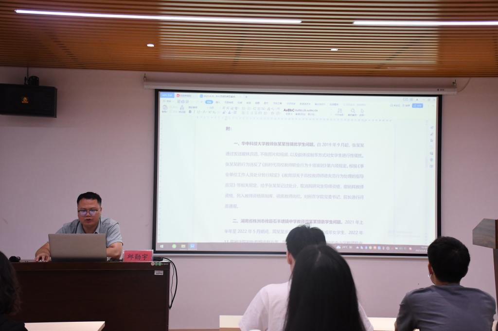 会上与会党员学习了《习近平总书记关于师德师风的重要论述摘编》《新时代师德规范》《师德优秀典型先进事迹》,学习了深刻领悟了师德规范精神。随后,邱勋宇为大家列举了教育部公布违反师德典型案例,开展警示教育。最后,他表示教师为党育人的初心不能忘,为国育才的立场不能改,要坚持师德为先,树立中国特色社会主义理想信念,始终践行立德树人根本任务,以人为本,规范行为担起教书育人的使命