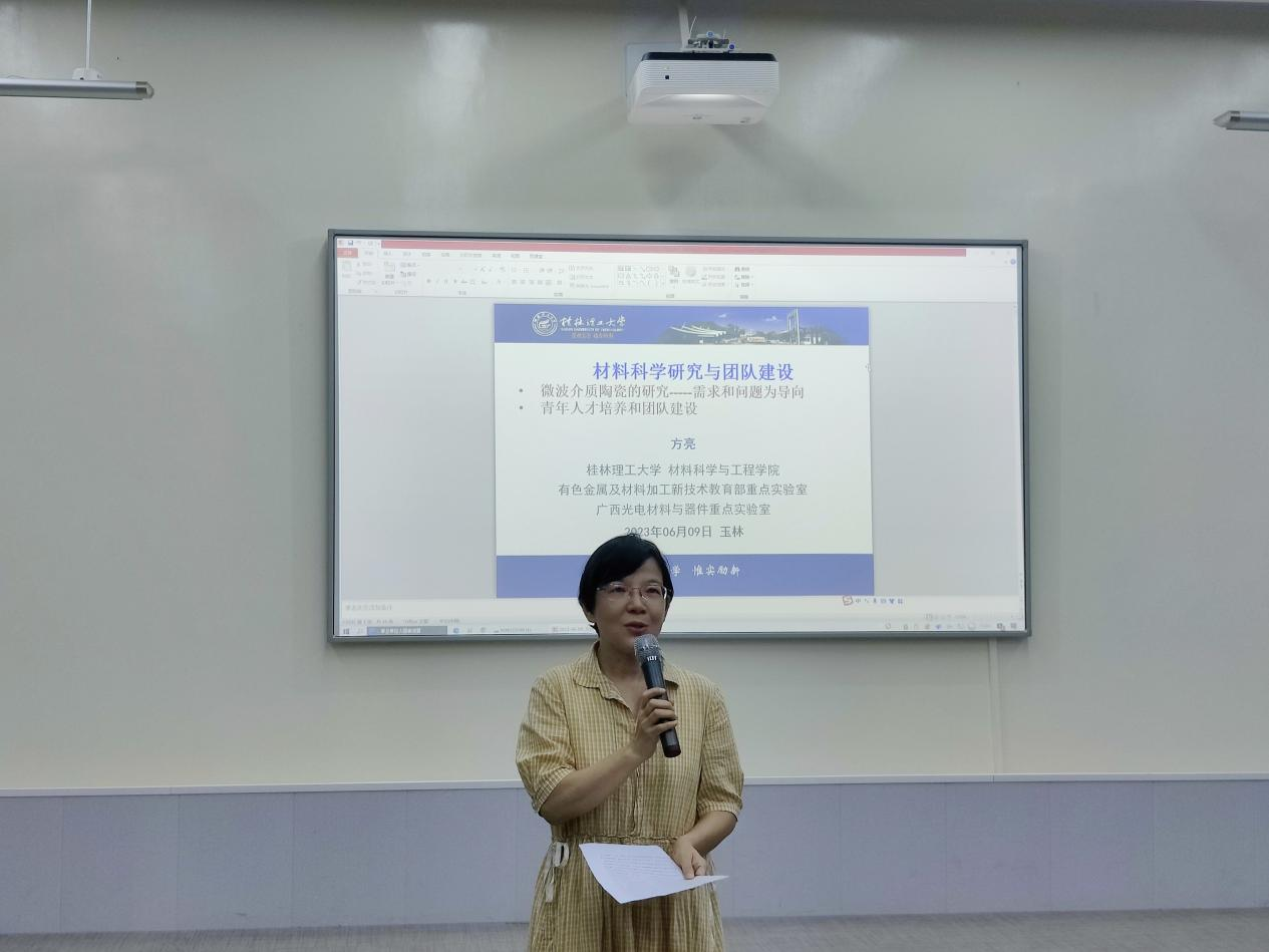 首先,方亮教授为师生作题为《材料科学研究与团队建设》的学术报告,他从我国的5G通讯、低温共烧(LTCC)微波介质陶瓷、低温与低介微波介质陶瓷的探索、影响谐振频率温度系数及性能的新机制及广西微波介质陶瓷产业的发展机遇等方面进行介绍,同时介绍了其课题组在微波介质陶瓷领域的研究工作和成果。其次,他讲述了培养青年人才及建设科研团队关键在于建立良好的科研氛围,同时要加强国内外合作与交流。