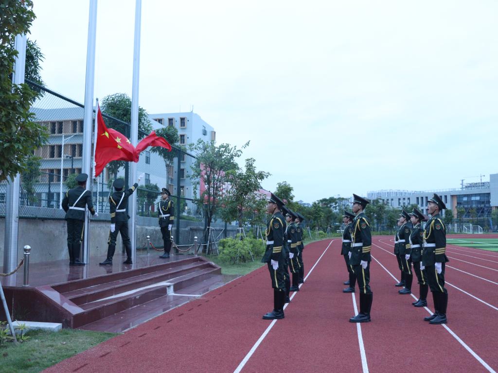 七点整,国旗护卫队迈着整齐而矫健的步伐,喊着响亮的口号,护卫五星红旗入场。伴随着高昂雄壮的国歌声,五星红旗冉冉升起,迎风飘扬,全体肃立行注目礼,齐唱中华人民共和国国歌。