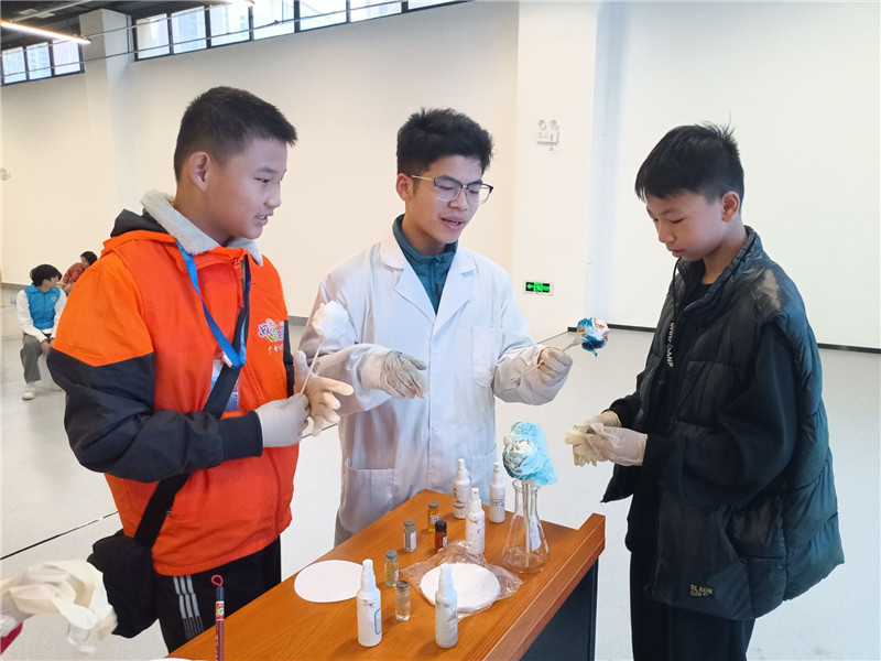 为深入学习贯彻党的二十大精神,传播科学思想,激发青少年探究科学的兴趣和对科学的热爱,1月20日,太阳成tyc7111cc“壮健”团员服务先锋团到玉林市科技馆开展以化学趣味实验、科技与生活知识科普、多彩非遗、低碳发展和谐共生等为主要内容的科普宣传活动。活动以现场实验展示、趣味游戏、有奖竞答的方式进行,让青少年儿童从化学的角度认识世界,在探索中收获知识,活动得到群众的点赞和好评。