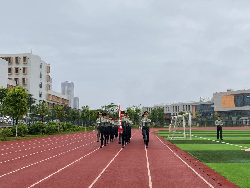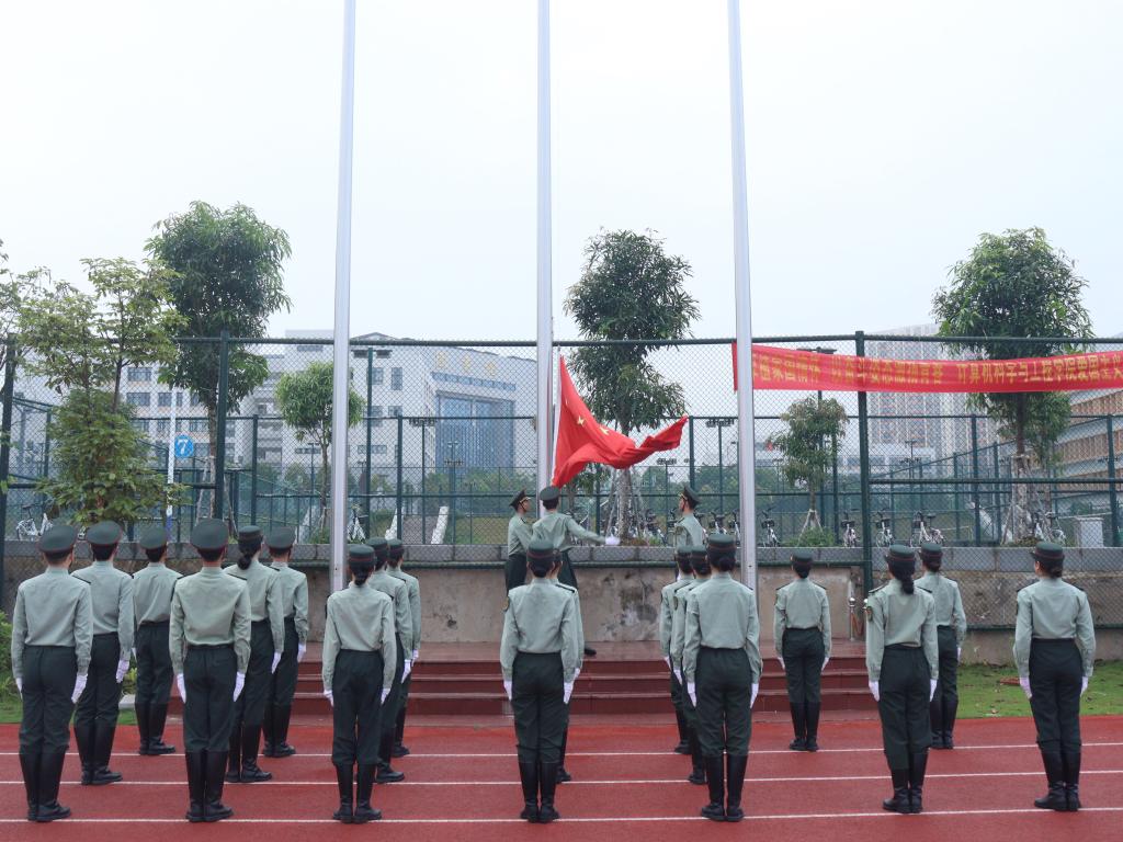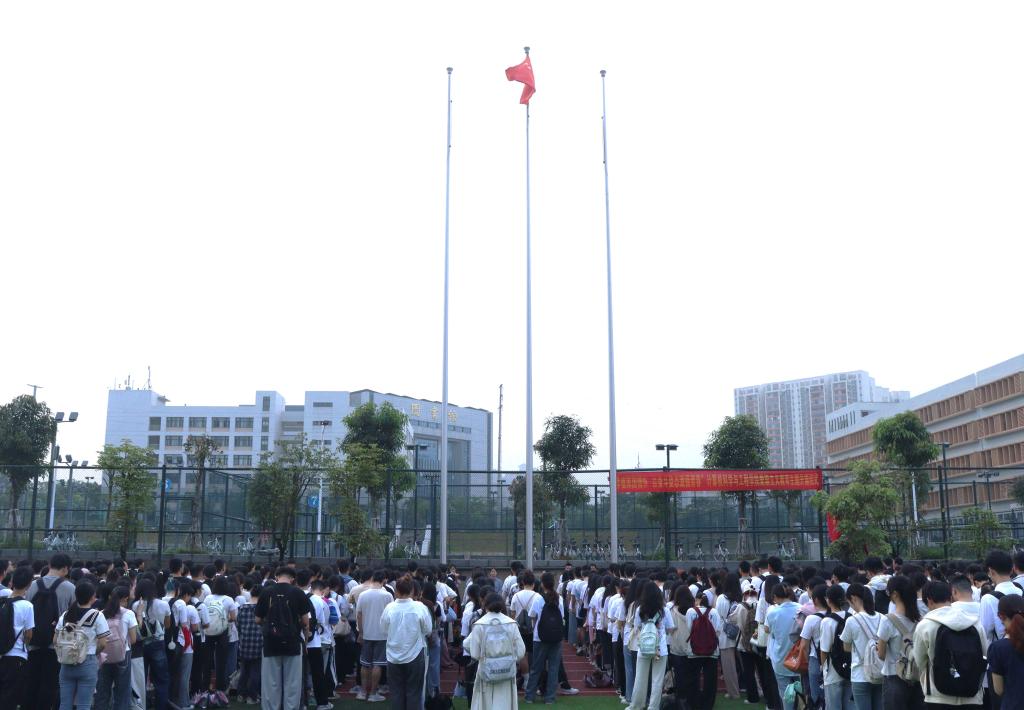升旗仪式上,伴随着雄壮嘹亮的国歌,五星红旗冉冉升起,全体师生面向国旗注目肃立。